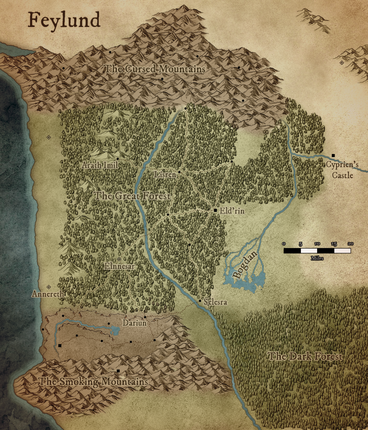 Much of the history and geography of Feylund remains unknown to all, except for the dwarves. The men stay in their mountains, caring nothing for anything beyond their borders. The elves are locked in a constant struggle with the wolves and vampires, and know of nothing beyond the Great Forest. And the dwarves, who hold these secrets, see little reason to share them, and carve them instead on their caves.